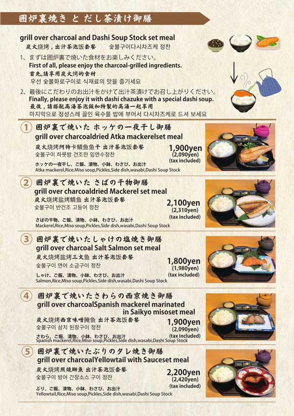目の前の大きないろりで豪快に焼かれる旬の食材、四季折々のお料理をお楽しみください。